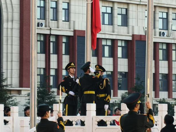 上午7时,国旗护卫队迈着铿锵有力的步伐,护卫着五星红旗来到国旗杆下。伴随雄壮激昂的《义勇军进行曲》,鲜艳的五星红旗冉冉升起,迎风飘扬。全体人员面向国旗行注目礼,齐声高唱国歌,抒发对伟大祖国的无限热爱与崇高敬意。