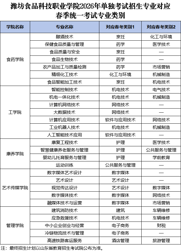 潍坊食品科技职业学院2026年单独考试招生专业对应春季统一考试专业类别