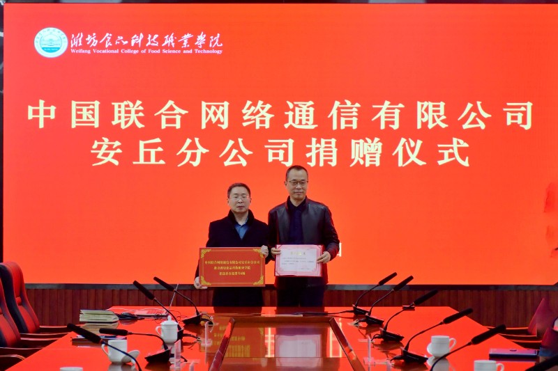 3月15日上午,中国联合网络通信有限公司安丘分公司捐赠仪式在我校图书馆第一会议室举行。安丘市联通公司总经理孟凡明、副总经理王金明,国开教育集团副总裁焦明秀,潍坊食品科技职业学院副校长张学东、副校长田敬成出席捐赠仪式。此举旨在支持和助力平安校园的建设,展现了中国联通作为国有企业的社会责任感和对教育事业的支持。